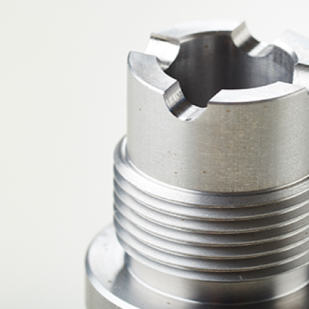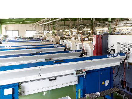 弊社はバー材からの完品加工に特化し、鉄・アルミ・真鍮といった材種の製品を製造しています。生産ラインは、材料を自動供給する給材機を完備し、時間や人手を省力化。また、切粉による設備停止や加工中のトラブルを最小限にするため、長年培ったノウハウを生かして独自の切削工具を設計・製作してよりよい製品づくりに生かしています。